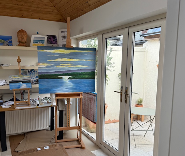 During lockdown I have discovered some of my natural habits. One of which is getting up early in the morning. I often go out to the river and have noticed that just about half an hour before the sun rises the fish large and small all start jumping. The moment the sun creeps over the horizon they stop. I painted that moment just before the sun broke free of the hills across the river.